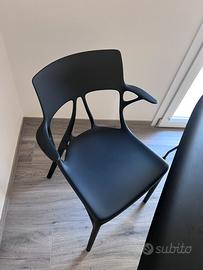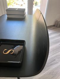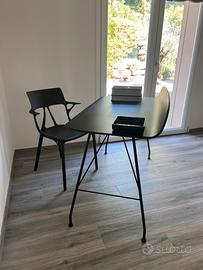 Scrivania Kartell Earl of Wood e sedia AI Philippe Starck versione Total Black piano in legno di frassino curvato 3D tinto nero e struttura in acciaio verniciato nero. La particolarità di questa scrivania è lo schienale curvato che scende dolcemente verso il piano, creando una silhouette unica e accogliente. Dettagli tecnici: • Dimensioni: Larghezza 119 cm, Profondità 65 cm, Altezza totale 87,5 cm. • Materiale: Legno curvato con tecnologia 3D brevettata e base in acciaio. • Funzionalità: Dotata di un pratico scasso centrale sul bordo posteriore per il passaggio ordinato dei cavi di ricarica e alimentazione computer. • Stato: Ottime condizioni, pari al nuovo. Il legno presenta la sua bellissima venatura naturale a vista sotto la finitura nera.