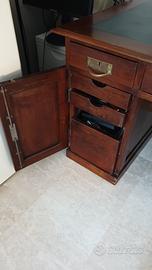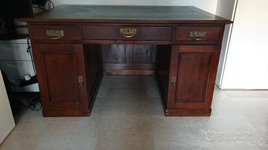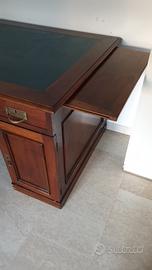 Scrivania elegante in legno massello dal fascino classico, caratterizzata da una finitura calda color noce che valorizza le venature naturali. Il piano superiore verde ideale per scrivere e lavorare con comfort. Dotata di tre cassetti frontali con maniglie in metallo dal design tradizionale, offre spazio pratico per documenti e accessori. Ai lati, due vani con sportelli aggiungono ulteriore capacità contenitiva, perfetti per organizzare materiali da ufficio. La struttura solida e ben proporzionata la rende adatta sia come scrivania da studio che come elemento d’arredo per ambienti classici o professionali. Presenta normali segni di utilizzo che ne testimoniano l’autenticità e il carattere Con scrittoio color verde e possibilita' di estendere il piano lavoro da entrambi i lati. Ottime condizioni, serrature funzionanti , doppia chiave , diversi cassetti molto campienti con doppia anta di chiusura. Tutti i cassetti presentano la carta 'giglio fiorentino' all'interno. Restaurata Tenuta sempre in casa. Ritiro a carico dell'aggiudicatore, la scrivania si trova a Monza (Italia) dimensioni altezza 80cm larghezza 145 cm profondita' 95 cm Tutto come da foto