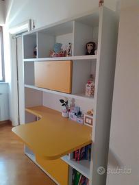Vendo scrivania con libreria annessa bianca con inserti gialli, due ante scorrevoli, altezza 187cm, larghezza 138cm, profondità libreria 33cm, scrivania 81cm (escluso prese elettriche).