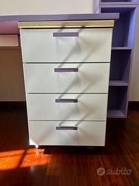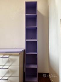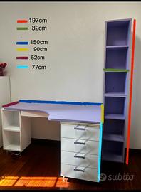vendo scrivania lilla ad angolo con cassettiera integrata e cassetto sotto il piano di lavoro e libreria abbinata divisibile in due parti.