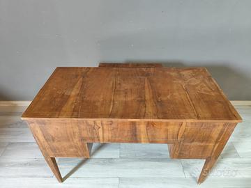 Antica ed elegante scrivania da centro di epoca Luigi XVI a cinque cassetti. Finemente lastronata in noce con delicati intarsi in acero su tutte le superfici. Sul fronte troviamo cinque cassetti di cui uno centrale più grande con piano scorrevole sovrastante. I cassetti presentano dei segreti realizzati con doppi schienali.