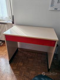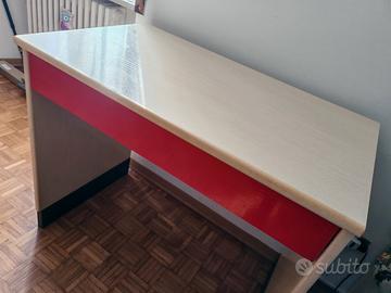 Vendo scrivania usata con ampio cassetto, ancora in buone condizioni. Ottima da usare anche come piano lavoro. Ci ho montato un rialzo (rimovibile) perché mi faceva comodo avere il piano più alto.