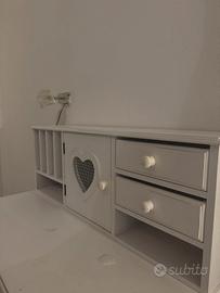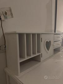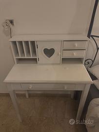 Graziosa scrivania in legno color bianco, stile romantico/shabby chic. Dotata di pratico organizer superiore con scomparti, due cassettini e un'anta centrale decorata con cuore. Presente anche un cassetto sotto il piano di lavoro.
