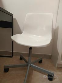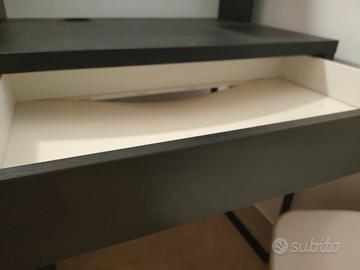 vendo scrivania Mike con sedia con le rotelline in plastica. tenuta bene, unica parte danneggiata è la parte sotto del cassetto che col peso dei documenti si è curvato per il resto è in Buone condizioni. Ritiro a mano