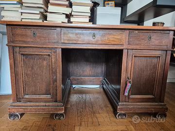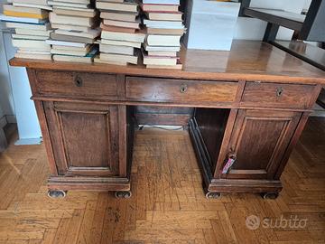 scrivania primi novecento, in buone condizioni, tre cassetti, due vano con sportello e ripiani. in legno.