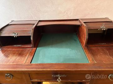 Splendida e rara scrivania ministeriale d'epoca in legno massello, caratterizzata da un design unico a doppio corpo laterale con chiusura a serrandina. Un pezzo di grande fascino, ideale per studi professionali, uffici di rappresentanza o arredamento vintage industrial. - Doppio corpo laterale con due vani a serranda perfettamente funzionanti. - Ampio piano di lavoro con inserto centrale in panno/similpelle verde. - 4 cassetti laterali capienti + 1 cassetto centrale sottopiano con serratura. - Maniglie e bocchette originali in ottone lavorato. Chiavi incluse. Condizioni: Il mobile è solido e strutturalmente integro. Presenta una bellissima patina del tempo con naturali segni di usura sulla finitura del legno (come da foto), che ne testimoniano l'autenticità. Le serrandine scorrono correttamente.