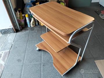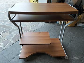 Scrivania e mobile porta pc in legno con telaio in metallo e rotelle.