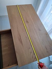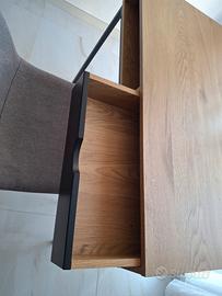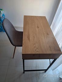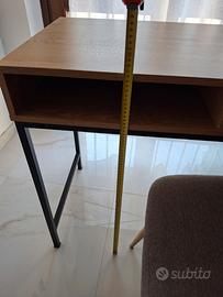 scrivania moderna design industriale con gambe in metallo e ripiano effetto legno. dotata di cassetto e vano. Misura 48cm×95 cm. sedia abbinata. le misure sono indicate anche in foto. ritiro a domicilio.