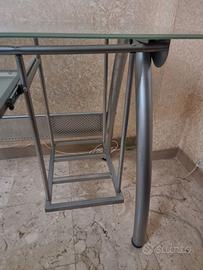 Scrivania moderna in ottime condizioni, con piano in vetro e struttura in metallo verniciato argento, molto solida. Dimensioni: lunghezza 115 cm, larghezza 55 cm, altezza 70 cm. Dotata di ripiano estraibile per tastiera o laptop 55X25 cm e di ripiano inferiore (in basso a destra) per appoggio oggetti o PC. Perfetta per postazione PC, studio o games.