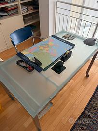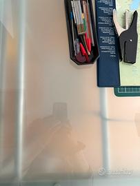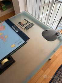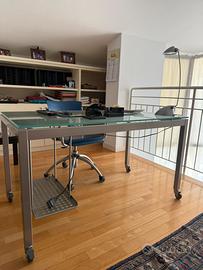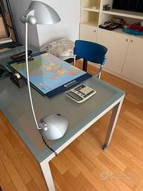 Scrivania moderna in vetro temperato + sedia con ruote Vendo elegante scrivania dal design minimal con piano in vetro temperato, perfetta per home office o studio. Linea pulita e leggera, ideale anche per ambienti moderni o piccoli spazi perché visivamente non appesantisce. Inclusa sedia con ruote, comoda e funzionale per utilizzo quotidiano. Misure scrivania: •Lunghezza: 130 cm •Profondità: 70 cm •Altezza piano: 73 cm Caratteristiche: •Piano in vetro temperato resistente •Struttura solida e stabile •Facile da pulire •Perfetta per lavoro da casa o studio Condizioni ottime Ritiro a mano preferito (vista la delicatezza del vetro).