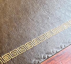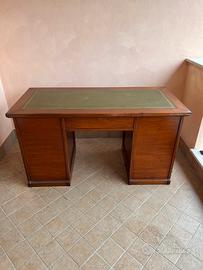 SCRIVANIA modernariato vintage in legno massello color noce con rivestimento in vera pelle verde scuro.
