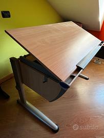 Scrivania Moll, modello ergonomico, regolabile in altezza con piano variabile tra un altezza di 52 cm e 82 cm da terra. Piano inclinabile, righello, portapenne e cassetto cn divisori.