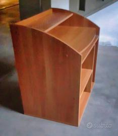 Scrivania / postazione per Computer e stampanti per casa, cameretta o ufficio, si presenta con un piccolo ripiano al di sopra del piano pc, uno subito al di sotto a scomparsa (porta tastiera), 2 scomparti per stampanti / scanner / fax o altro ed uno scomparto verticale per Case PC o altro, è compatta e funzionale, di color legno chiaro