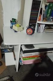 Scrivania (con rotelle piroettanti) bianca multifunzione con ripiani e vani portaoggetti.