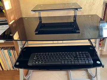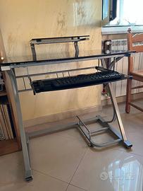 Scrivania in alluminio e vetro, con comodo piano retraibile e secondo piano per stampante o monitor.