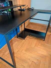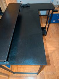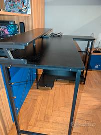 Vendo scrivania nera con rialzo per i monitor e braccio al lato.