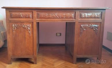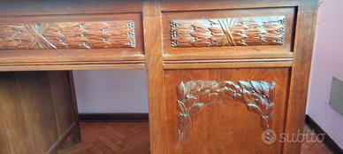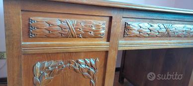 Magnifica scrivania notarile in uso presso uno studio storico in Pordenone. Il legno è un noce dei primi del novecento con pannelli posteriori arricchiti da fregi a sbalzo intagliati a mano. Ampio inserto centrale in pelle sul piano superiore. Due ante anteriori su capienti e profondi spazi per libri o altro. Presenta poi due cassetti laterali ed uno centrale.