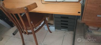 Scrivania prodotta da Olivetti modello Synthesis serie 45 anni 70 disegnata da Ettore Sottas. Piano in legno, cassettiera composta da 5 cassetti in plastica e struttura dei piedi in metallo. in buone condizioni, qualche difetto (segni del tempo). No spedizione