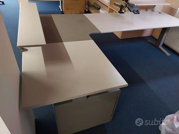 Composizione scrivania ad angolo, colore grigio chiaro e scuro, completa di cassettiera e portatelefono, altezza cm. 72, dimensioni cm. 180 x 280, larghezza tavolo 80 cm. Completa di due ripiani rialzati di dimensioni 22x90 e 22x130 cm.