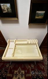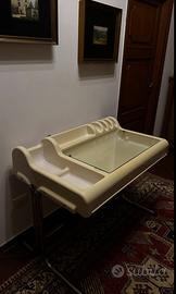 Scrivania anni 70 realizzata con un unico foglio di plastica stampata che crea la forma per vari supporti e spazi di archiviazione. C è anche un pannello di vetro integrato che può essere sollevato e una lampada da tavolo a scomparsa.
