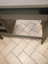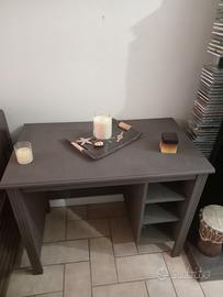 Scrivania per cameretta/studio color marrone con 3 piccoli scaffali a destra e piccolo spa io dietro per raccogliere cavi elettrici.