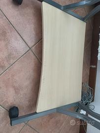 La scrivania la il primo ripiano in vetro, il secondo per la tastiera e l’ultimo in legno. Misure 80 x 58. Qualche segno di usura nel ultimo ripianonin legno per il peso del pc.