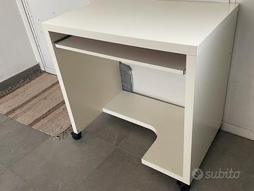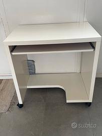 Scrivania compatta bianca con vassoio estraibile per tastiera e rotelle, ideale per piccoli spazi o uffici domestici.