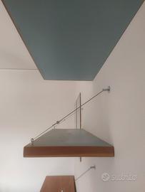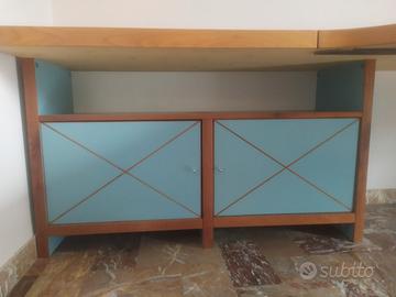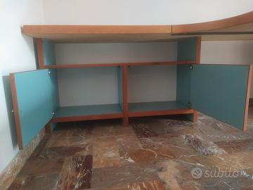 Penisola, uso ufficio, in legno con piano in finitura ciliegio, n.2 basi in laminato color celeste e n.3 mensole in laminato color celeste con tiranti in acciaio. Le bordature sono tutte il legno massello di ciliegio e parimenti il sostegno centrale. L’ancoraggio delle mensole è a scomparsa a mezzo di fischer (compresi) con sistema artigianale. Usato ma in ottimo stato di conservazione. Misure: Piano lungo fronte parete 3,60x0,58x0,05(h) Penisola 1,70x1,20x0,05(h)-(dal punto di contatto col piano lungo) Mensole (2) 1,16x0,35 Mensola 1,12x0,35 Basi (2) 1,24x0,40x0,70(h)