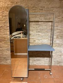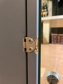 Scrivania nuova, usata solamente per riporre alcuni oggetti, presenta solamente difetti a livello delle cerniere dello specchio (perfettamente funzionante, difetto puramente estetico) dovute a problemi durante la consegna e presenta una piccola macchia all’interno dello scomparto.