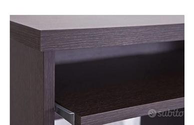 La scrivania è dotata di due ripiani scorrevoli ed estraibili, dove possono essere appoggiati tastiera e stampante, e 4 ruote che le consentono di essere spostata facilmente.