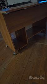 Pratica scrivania non ingombrante per pc, ottima per studenti o studio. In laminato color noce. Con comodo ripiano estraibile. Altezza cm 73 Larghezza cm 90 Profondità cm 60