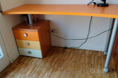 Scrivania con rotelle per cameretta ragazzi, con cassettiera, misure 150x60, 19€. Volendo con piccola aggiunta è disponibile una sedia ergonomica con rotelle e colore coordinato. Formula "visto e piaciuto" per entrambi i pezzi.