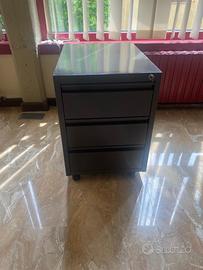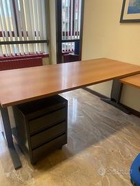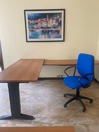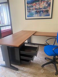 Scrivania per ufficio, in ottime condizioni, dotata di sedia ergonomica da lavoro e armadietto metallico dotato di tre cassetti.