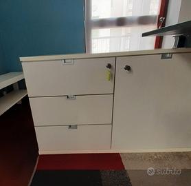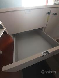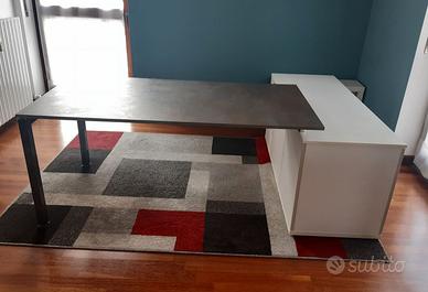 Vendo bellissima scrivania, misura del piano 80×160 x72H color grigio antracite finitura cemento, completa di modulo laterale 141X56x63H costituito da tre contenitori con serratura e top bianco nobilitato (cassettiera 3 cassetti e due moduli contenitori con anta destra e sinistra). Dettagli eleganti. Ottimo stato, praticamente come nuova. Molto capiente e funzionale. Euro 1.000 (il prezzo originale d'acquisto era 2.400 euro). Ritiro e trasporto a carico dell'acquirente. Gli oggetti si trovano a Monza, già smontati e avvolti con millebolle pronti per il trasporto.