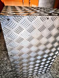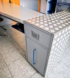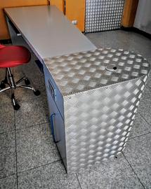 Originalissima! Realizzata in laminato grigio finitura cera con piano sagomato a forma trapeziodale con sotto piano in laminato blu elettrico. Mobile terminale bombato con sportello e cassetto, rivestito in lamiera mandorlata di alluminio trattata lucida. Realizzata artigianalmente su disegno personalizzato di un architetto. Bordi piano e fianco laterale da 4 cm in laminato "sale e pepe". Maniglie personalizzate in tondino di ferro blu elettrico. Completa di foro passacavi sul piano. VERA OCCASIONE per amanti del design!!