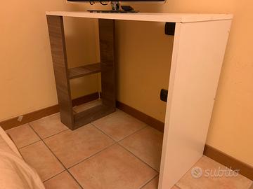 Scrivania piccola, adatta a postazione smart working o compiti a casa. Tenuta bene, colore bianco e marrone chiaro. Dimensioni: altezza 76, larghezza 90, profondità 40 cm. Disponibile fino al 26/01.