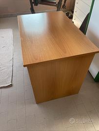 Una piccola scrivania di legno da ufficio con scompartimento per PC e con ripiano scorrevole da tastiera