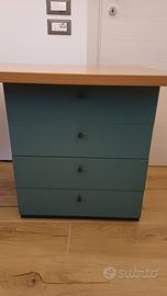 Scrivania con cassettiera, lunghezza 1.80cm, larghezza 58cm a destra e 76cm a sinistra. Mensola in abbinato lunghezza1.50cm e larghezza 32cm. Comodino in abbinato lunghezza 47.5cm, larghezza 45cm e altezza 50cm