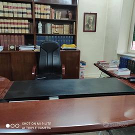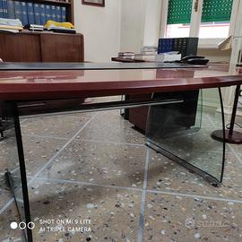 Vendesi scrivania in mogano con sedia, n. 3 poltrone e 1 cassettiera. La scrivania è totalmente in mogano, ha basi in vetro e cristallo e corredata da un allungo tondo, come da foto per riunioni. Poltrone e sedia con rotelle con braccioli e in pelle. Misure scrivania mt. 2,00 circa parte tonda per riunioni mt. 1,20x1,10