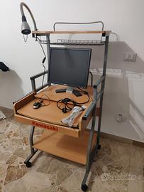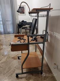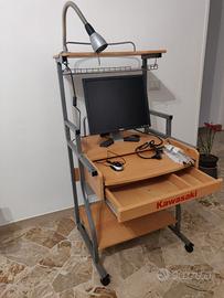 Scrivania porta computer con ruote e lampada, piani ad altezze diverse per poter mettere stampante, monitor, computer con tastiera e mouse. Con cassettiera. Misure 130 cm. altezza, 60 cm. larghezza 80 cm. profondità Buono stato.