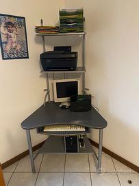 scrivania angolare salvaspazio ideale per piccoli uffici o camerette. la struttura è robusta in metallo grigio satinato con piano in legno nobilitato color antracite