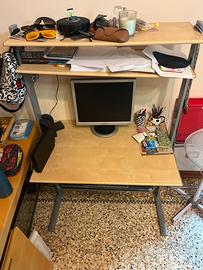 Vendo scrivania per computer con struttura in metallo e ripiani in legno chiaro.