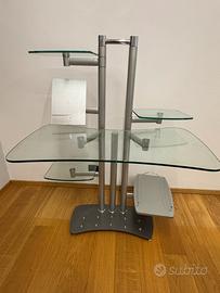 Scrivania porta PC fisso in vetro temperato e acciaio con tre ripiani in vetro e un ripiano porta unità centrale. Misure: h 130cm - larghezza 100cm - profondità 70cm.