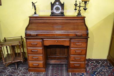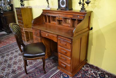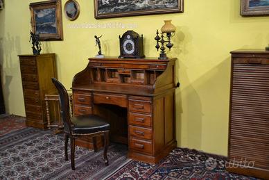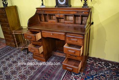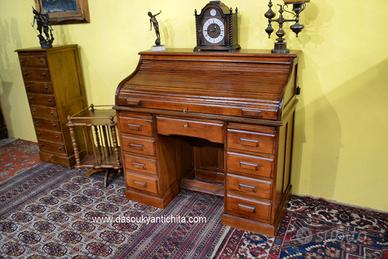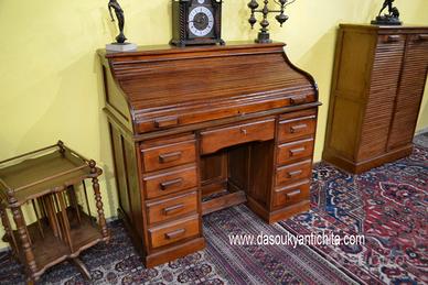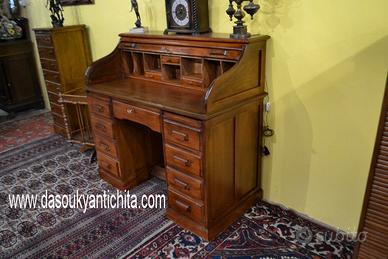 Piano superiore provvista di una chiusura a serranda, dove all’interno troviamo un ampio piano di scrittura delle dimensioni 115 cm. larghezza 34 cm. profondità , vani portadocumenti e cassetti