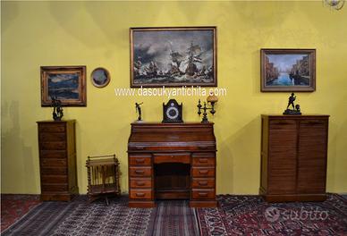 Scrivania postale in legno di rovere stile inglese , smontabile in due pezzi per facilitare il trasporto . Piano superiore provvista di una chiusura a serranda, dove all’interno troviamo un ampio piano di scrittura delle dimensioni 115 cm. larghezza 34 cm. profondità , vani portadocumenti e cassetti Al piano inferiore quattro spaziosi cassetti per lato e uno centrale. Lo scrittoio rifinito nella parte posteriore può essere inserito comodamente al centro di una stanza. Dimensioni: Larghezza 123 cm. Profondità 62 cm. Altezza 115 cm. ( dimensioni spazio centrale 64 cm. di altezza e 50 cm. di larghezza Chi fosse interessato a una visita virtuale della nostra galleria può accedere ai motori di ricerca, inserendo il nominativo " Dasouky antichita' " Per informazioni contattateci ai seguenti numeri Cell. - Cell. EURO 650,00 SPEDIZIONI IN TUTTA EUROPA CON CORRIERE ESPRESSO