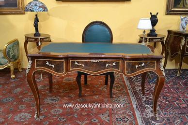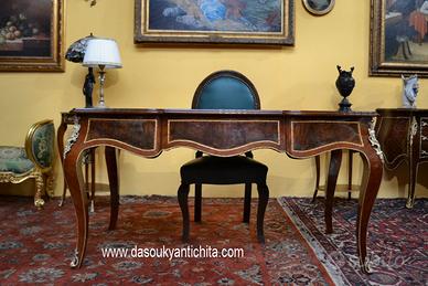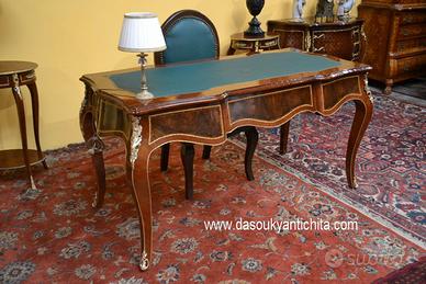 Scrivania presidenziale da centro stile Luigi XV in noce e radica di noce, piano centrato da riserva in ecopelle verde, fronte scandito da tre cassetti impreziositi da maniglie in bronzo dorato a motivo fogliaceo.