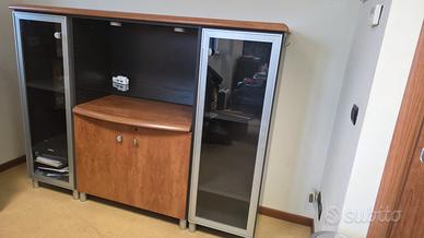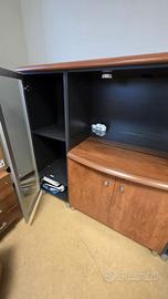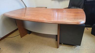 In blocco: Scrivania presidenziale (190 cm lunghezza) forma curvata con 2 cassettiere + vetrina + tavolino salotto: tutto in legno massello effetto radica, vetro sfumato grigio per la vetrina. Trasporto a carico dell'acquirente, già smontato, piano terra, zona Roma - Eur Torrino
