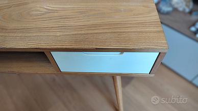 Scrivania per cameretta ragazzi Maison du Monde modello BUREAU FJORD Dimensioni: 120x55 cm, altezza 77 cm. due cassetti laterali e vano porta oggetti centrale. Piccoli difetti da usura sui bordi del piano come visibili nelle fotografie allegate.