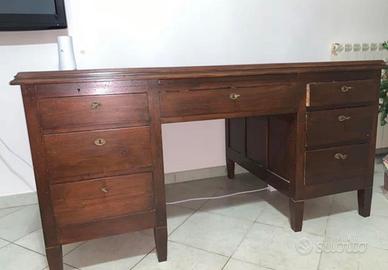 Scrivania antica ristrutturata, verniciata e lucidata, in tutto ci sono 3 cassetti laterali in due lati piu uno centrale, comoda per essere utilizzata come scrivania e come mobile per soggiorno.