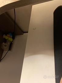 Bellissima scrivania bianco-grigia. Sono presenti piccolissime imperfezioni (nell’ultima foto) ma nel complesso la scrivania è ottima e in perfetto stato. Ha due cassetti e tre scaffali, in più il rialzo ottimo per il computer. È veramente comodissima e bella, comprata un anno fa.